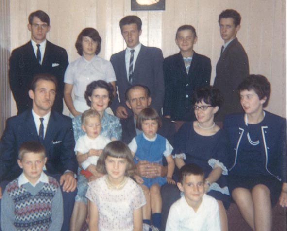 Dans la deuxième rangée : Jacques, Jérôme dans les bras de maman, Myrianne dans les bras de Papa, Odile et Denise.